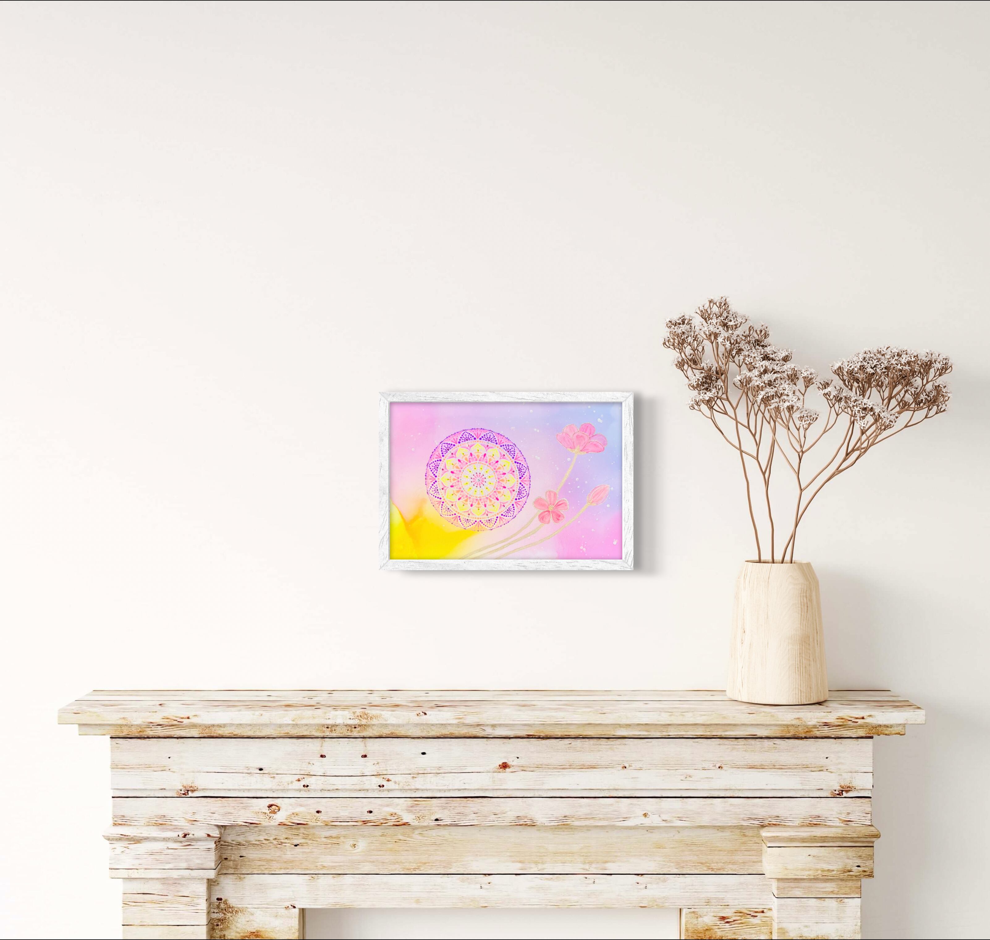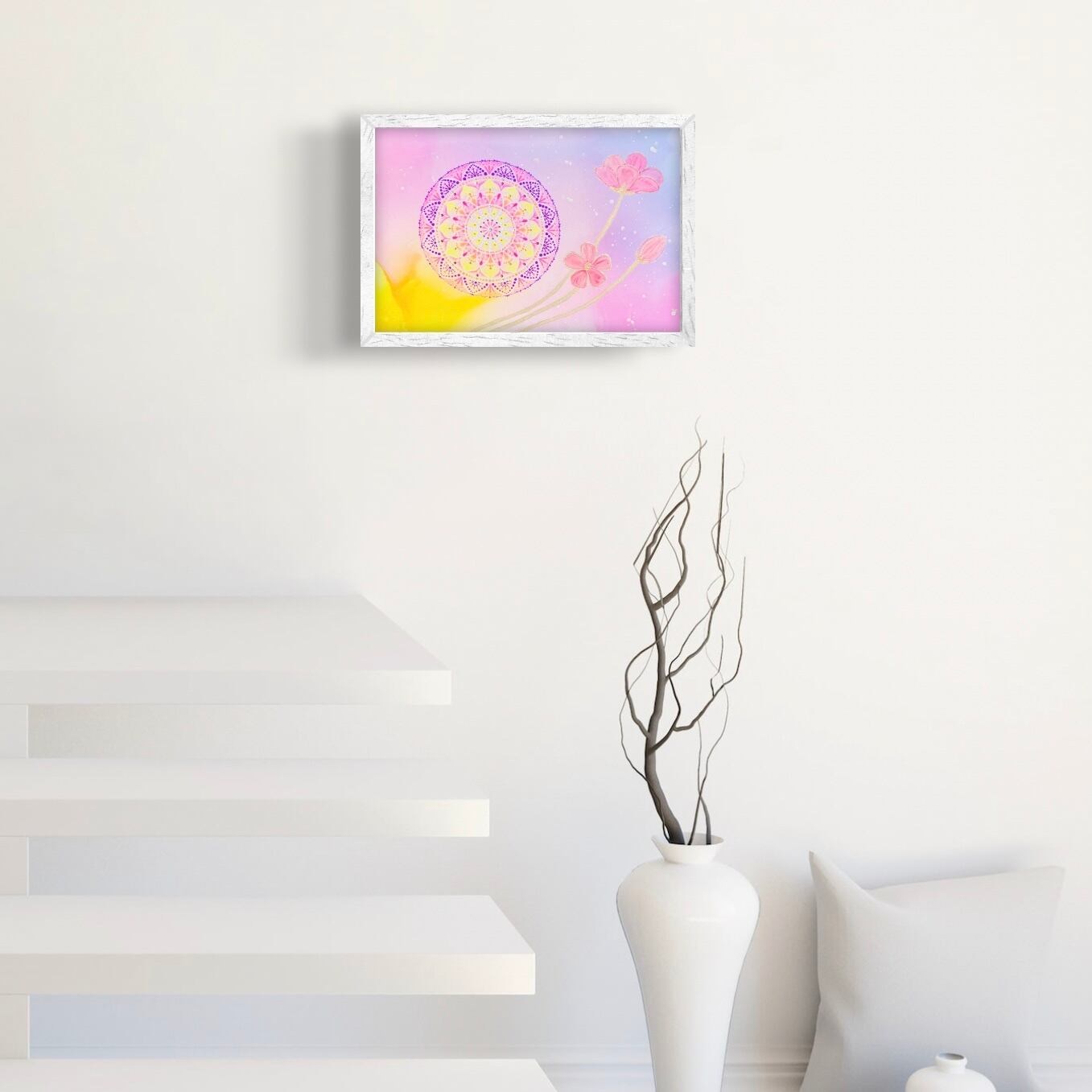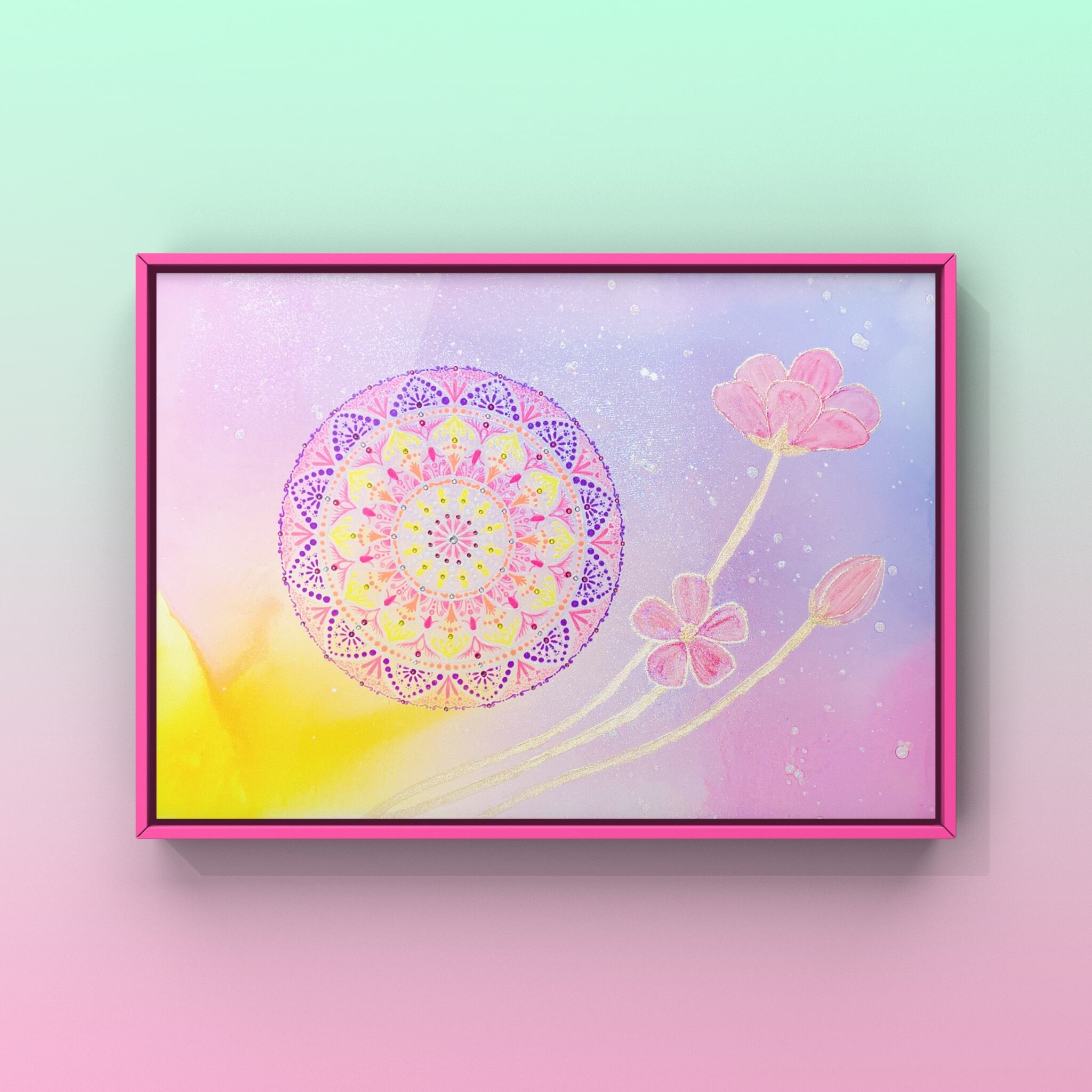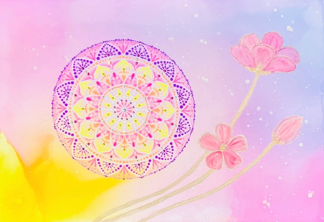 こちらは、美しいピンク系のグラデーション背景に、曼荼羅アートを施した作品です。