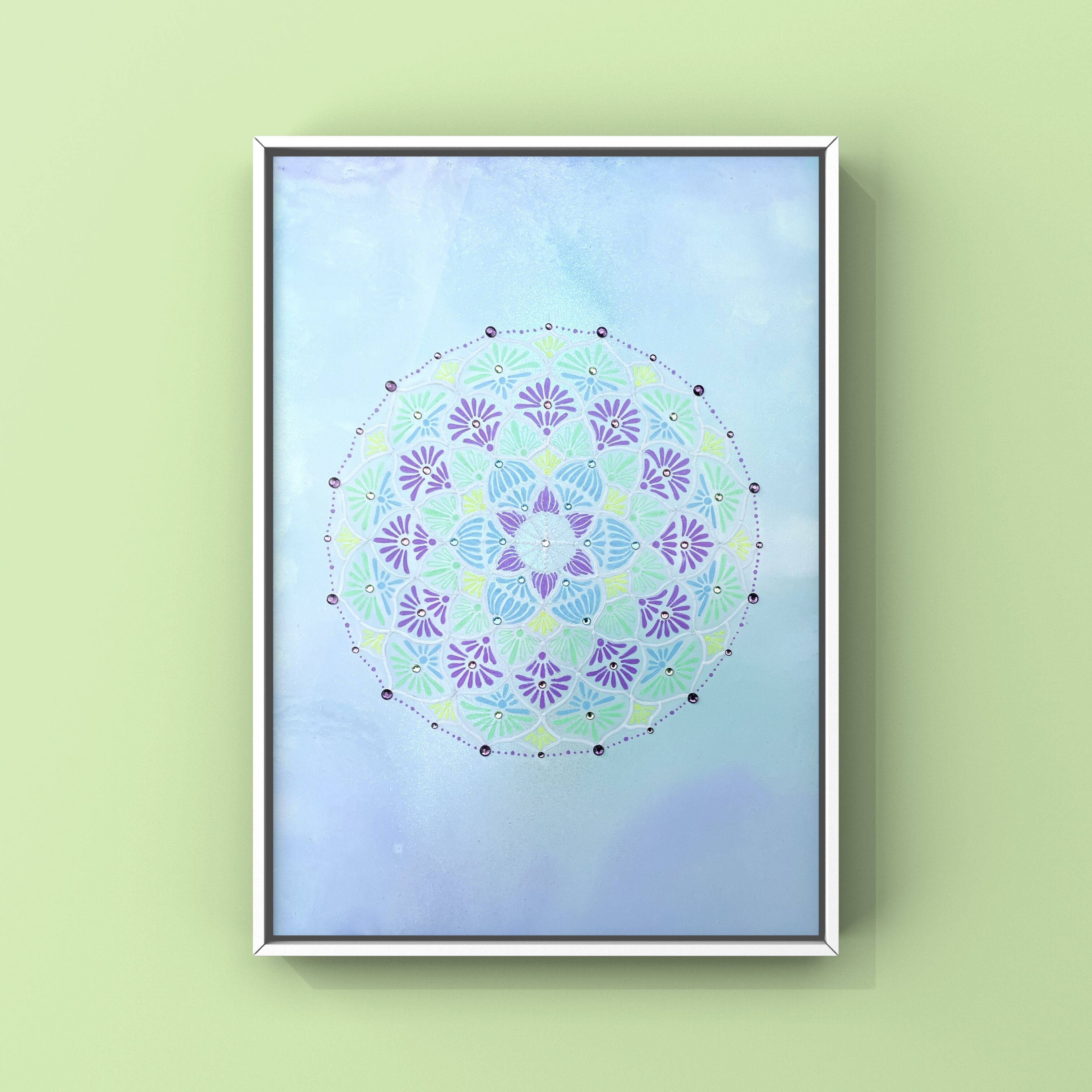 こちらの曼荼羅は背景をアルコールインクアートで描きその上に曼荼羅を描いています。